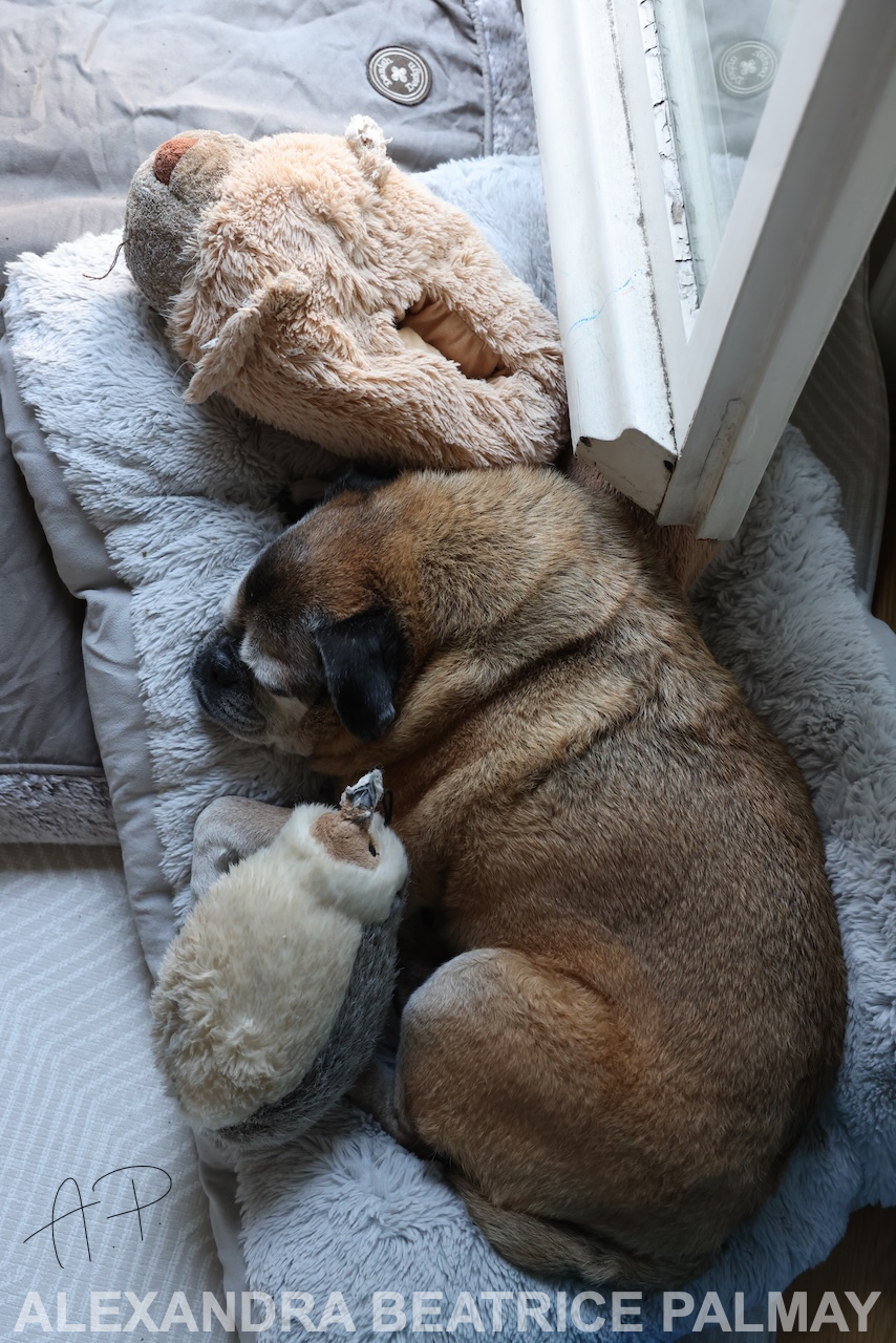 Tummy tickles were a must and he was given all the kisses every day of his life. He insisted on being blow dried after a bath and he loved being wrapped up in a soft blanket like a burrito. He loved Kensington Gardens and his friends there but most of all he just loved being with me. Curling up together either in my lap, or resting his prickly chin or his little drumstick legs on me- feeling his weight against my body, seeing his pug run of joy in the park or just sheer joy when I’d come home will be memories I cherish forever. I’m struggling to be eloquent as writing all of this makes me realise the immense weight of my loss.